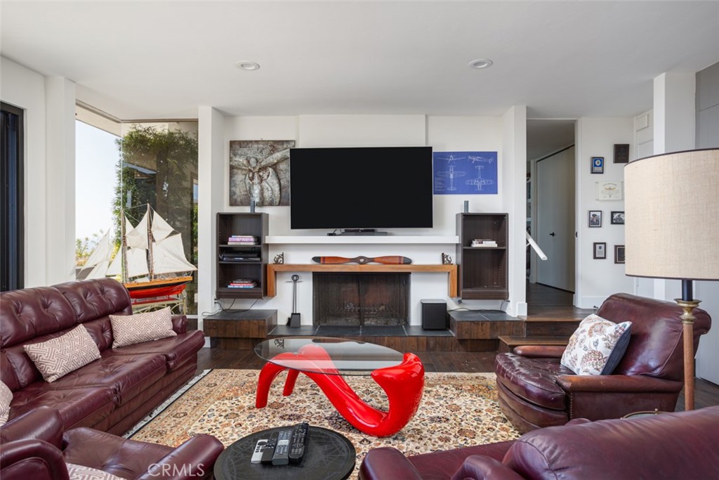 Main Level: Street entry opens to a spacious open-concept floor plan featuring sliding glass doors that frame the ocean views. The gourmet kitchen includes a breakfast counter and adjoins the dining area and living room with fireplace. Outdoor deck with seating area and fireplace ideal for entertaining.