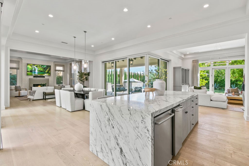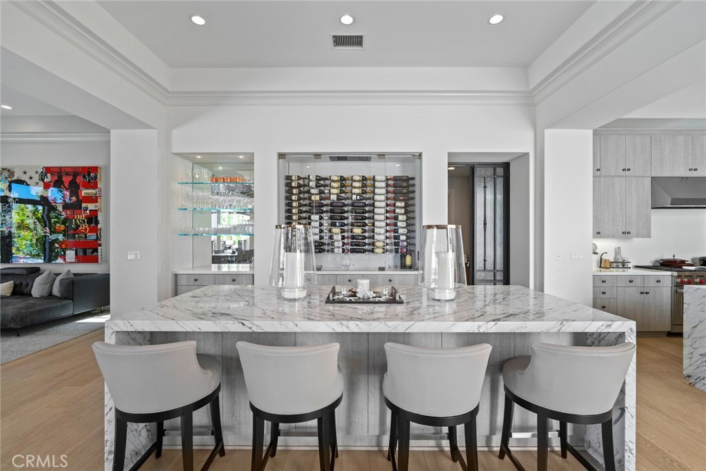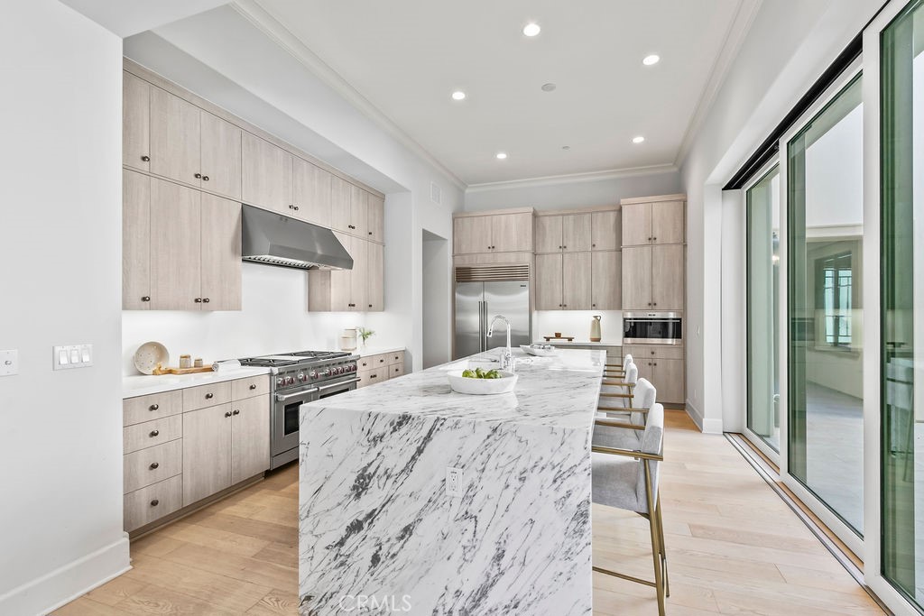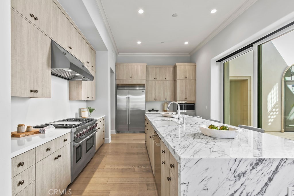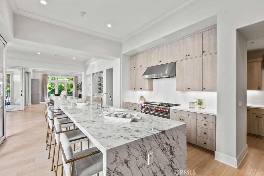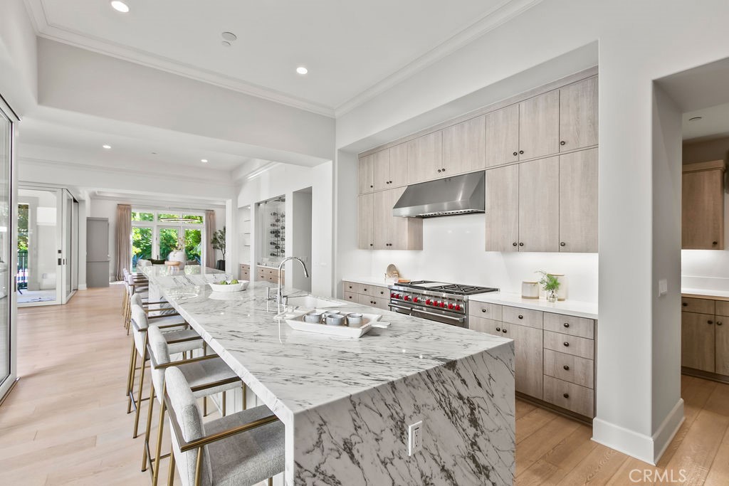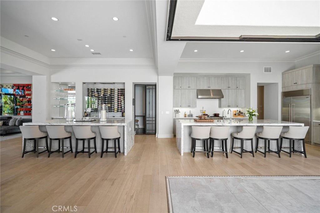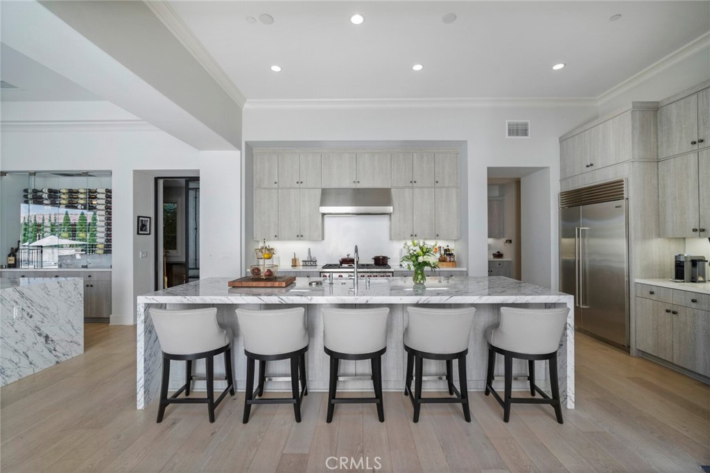 At the heart of the home is a gourmet chef's kitchen featuring dual oversized center islands with bar seating, professional-grade appliances, a generous walk-in pantry, and a fully equipped prep kitchen--perfect for hosting on any scale.