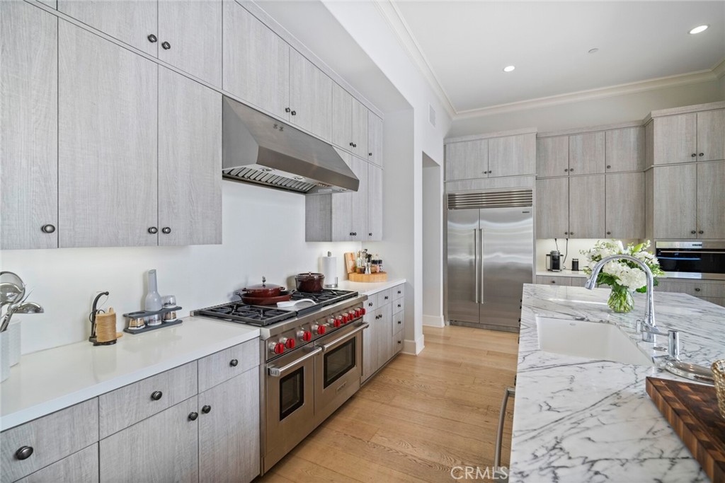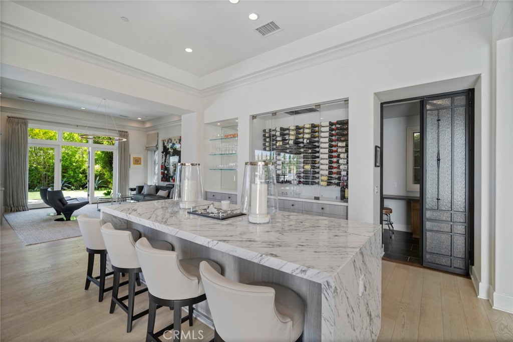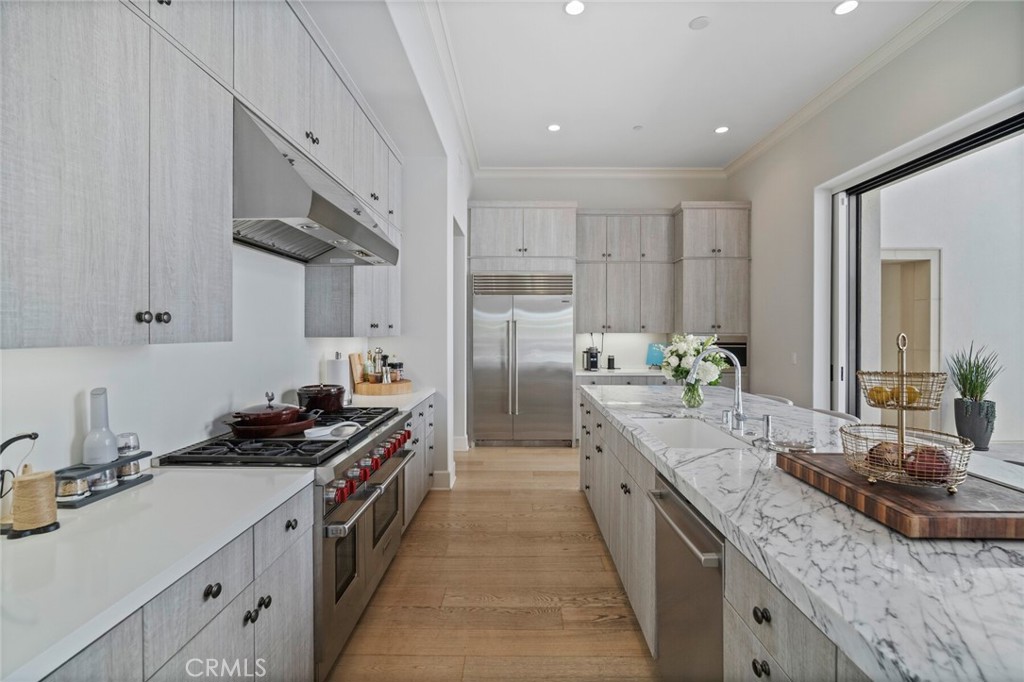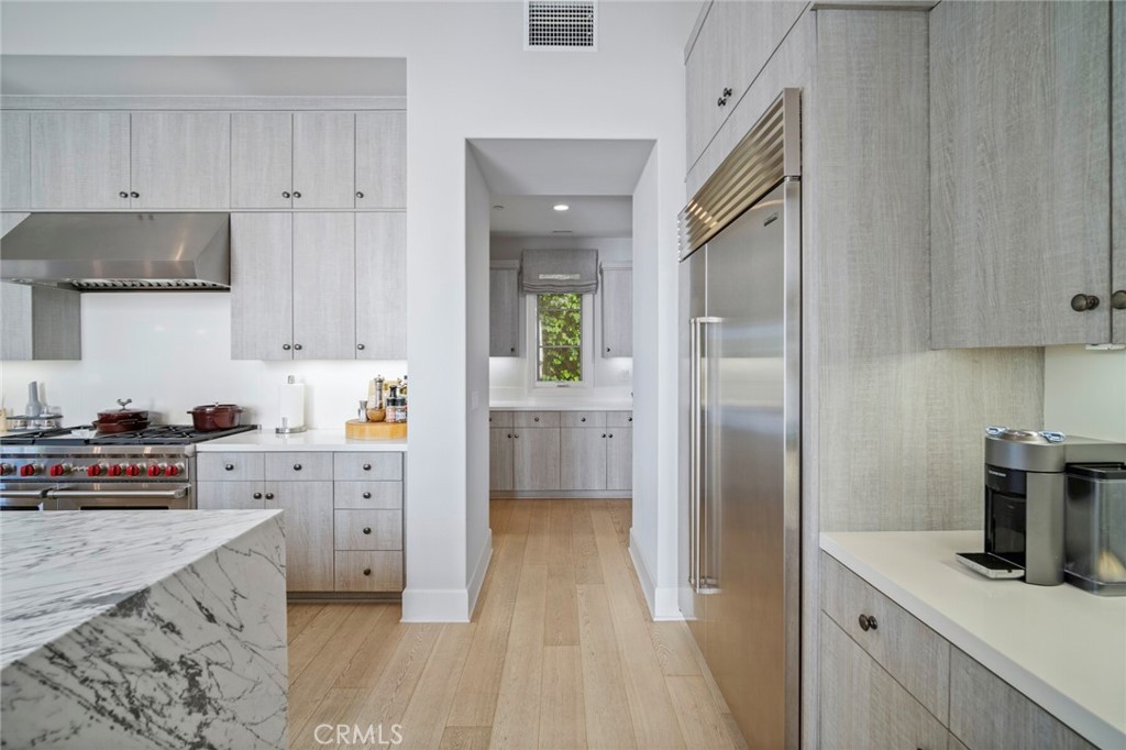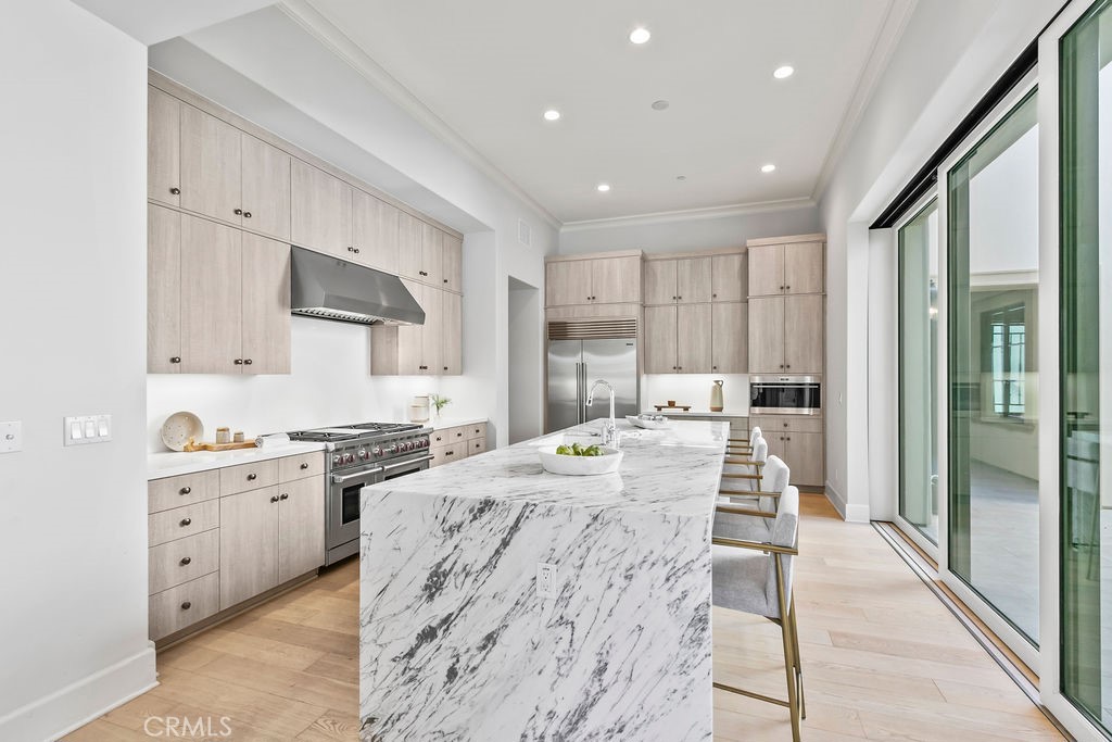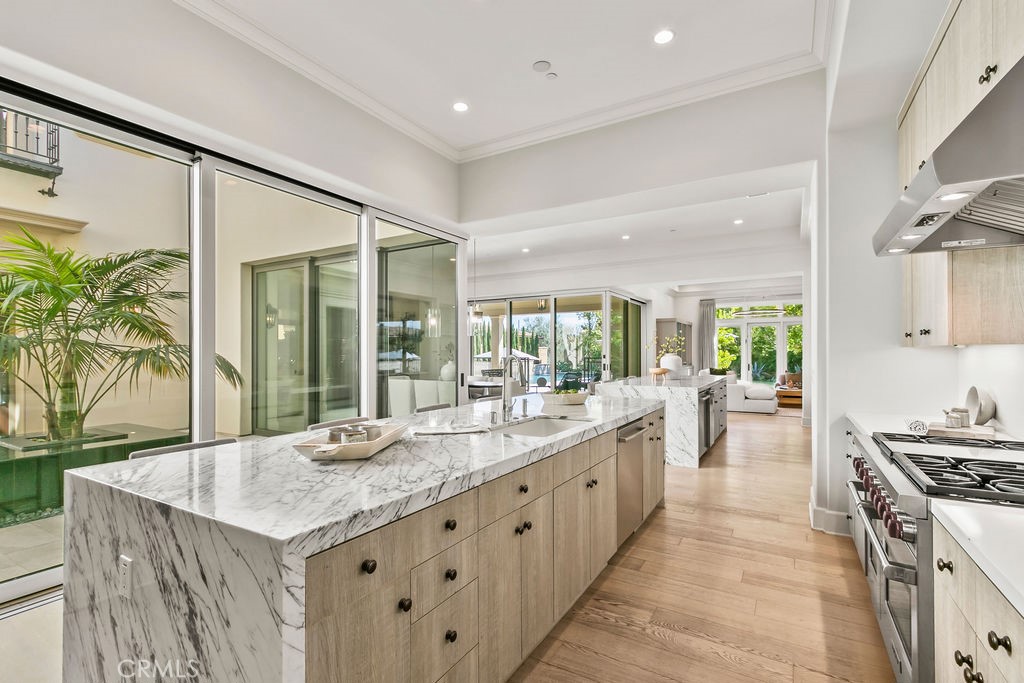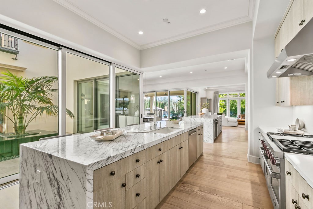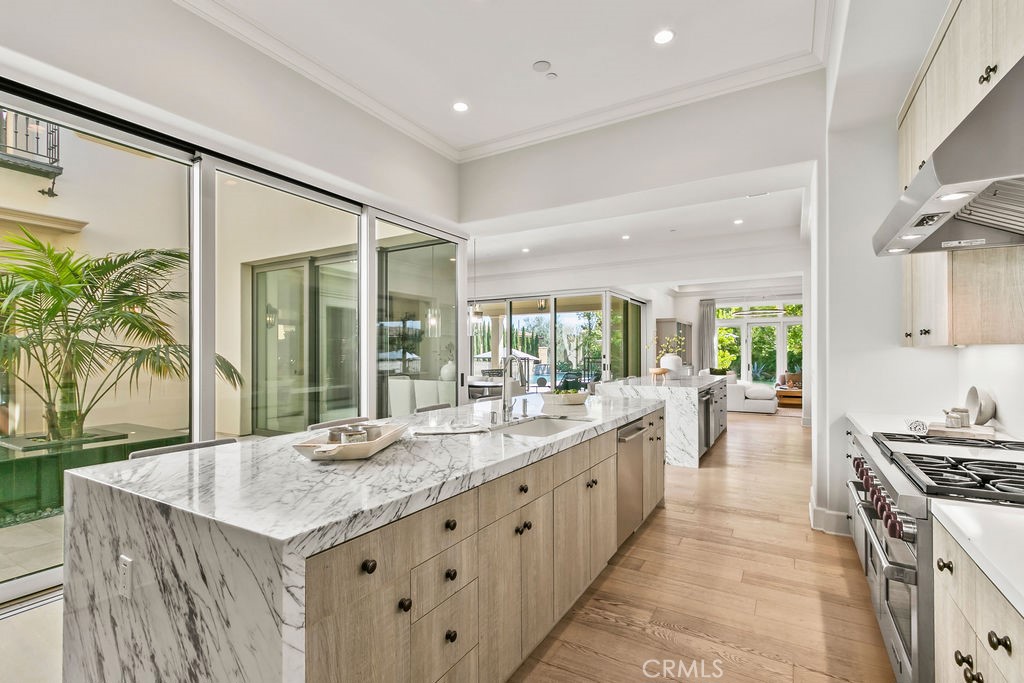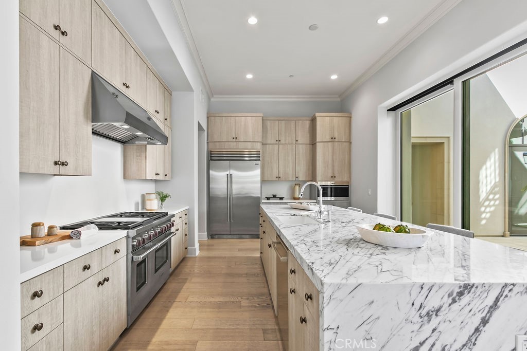 At the heart of the home is a gourmet chef's kitchen featuring dual oversized center islands with bar seating, professional-grade appliances, a generous walk-in pantry, and a fully equipped prep kitchen--perfect for hosting on any scale.