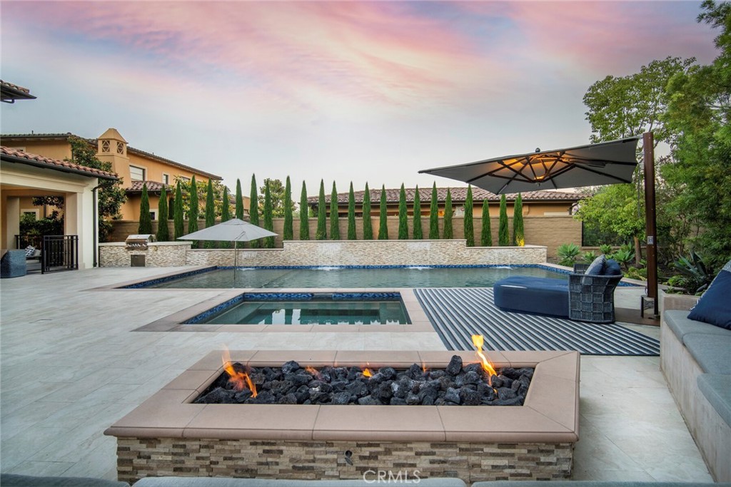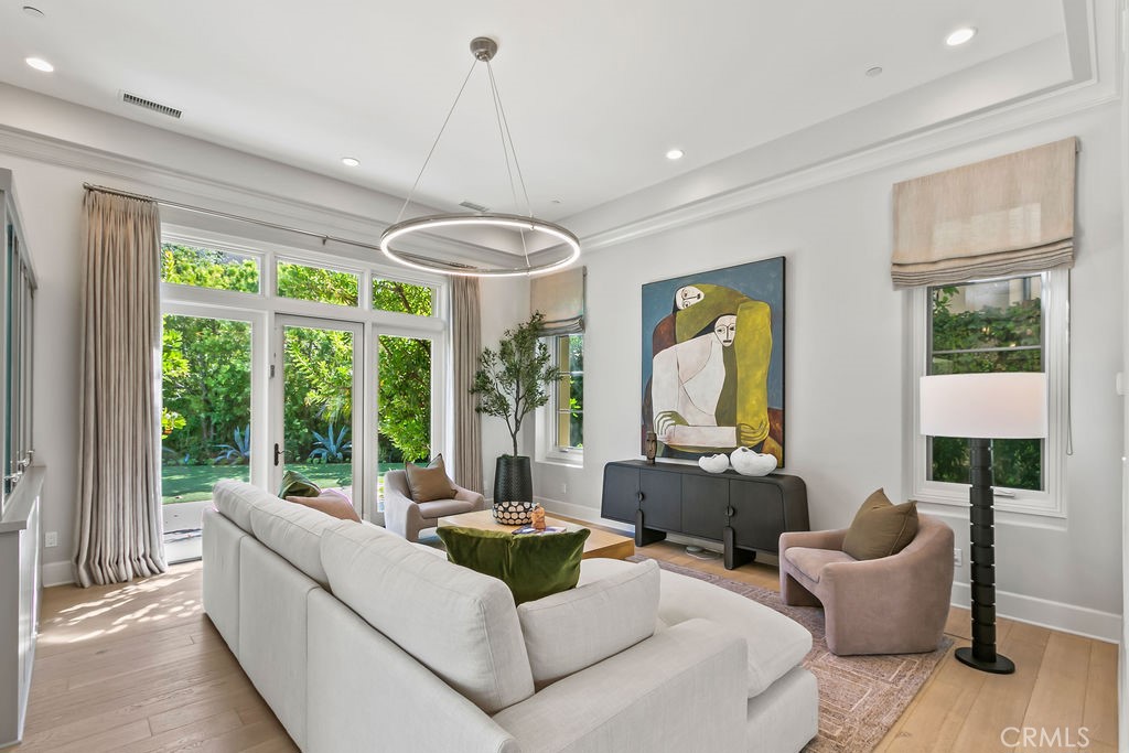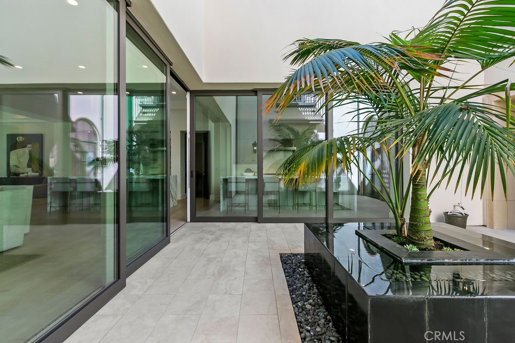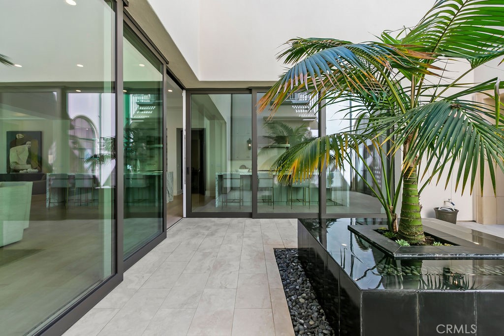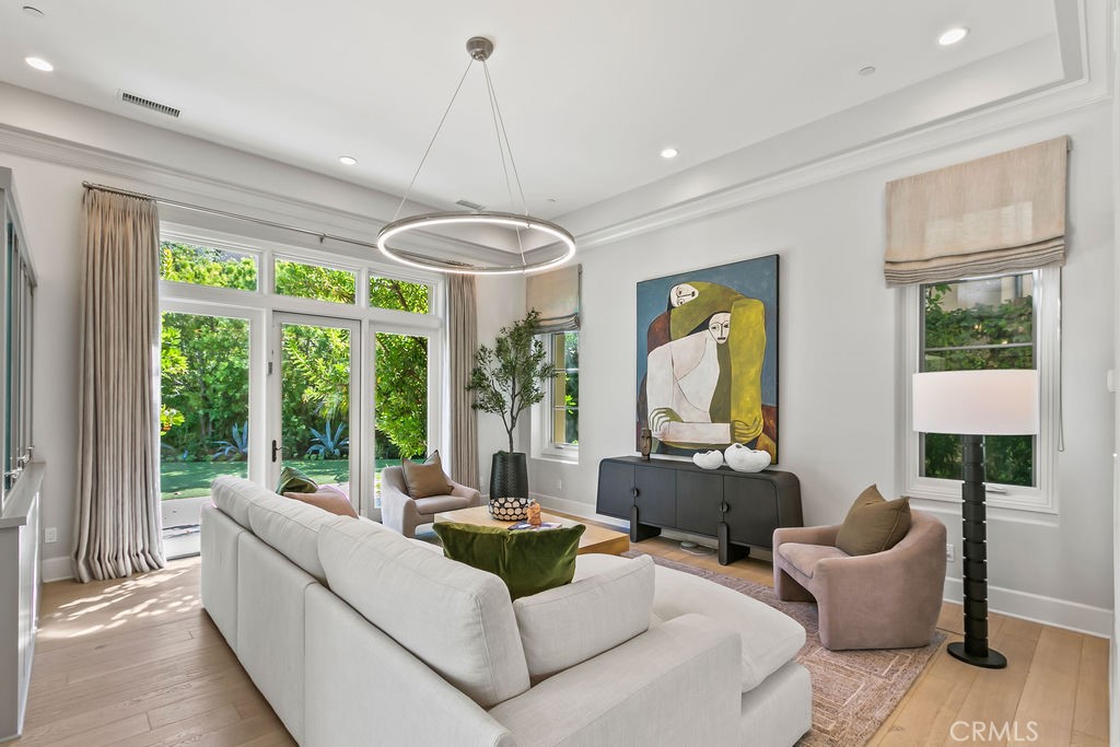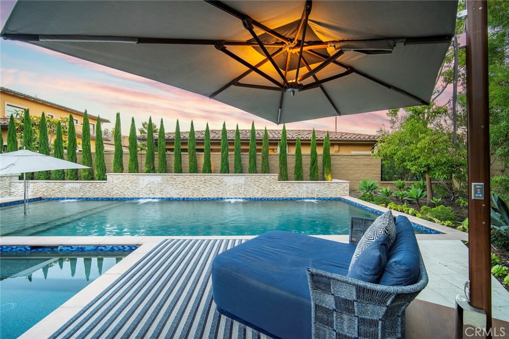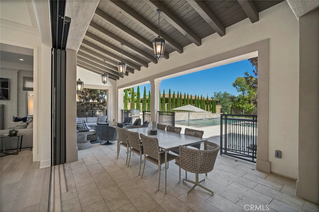 A gated front courtyard sets the tone for this natural light-filled home, where expansive living spaces are accentuated by soaring ceilings and walls of disappearing floor-to-ceiling glass doors--seamlessly connecting the indoors to the impressive private rear grounds. The large backyard is designed for entertainment, complete with a spacious pool and spa, lounge and dining patio, built in bar-b-que, fire pit, and a turf lawn.