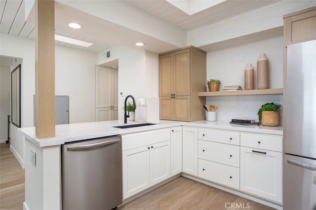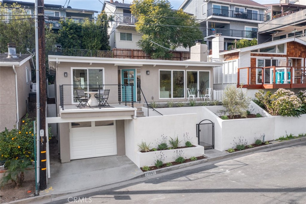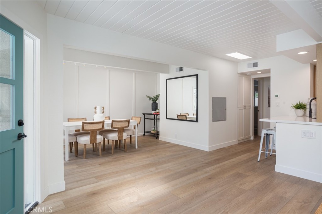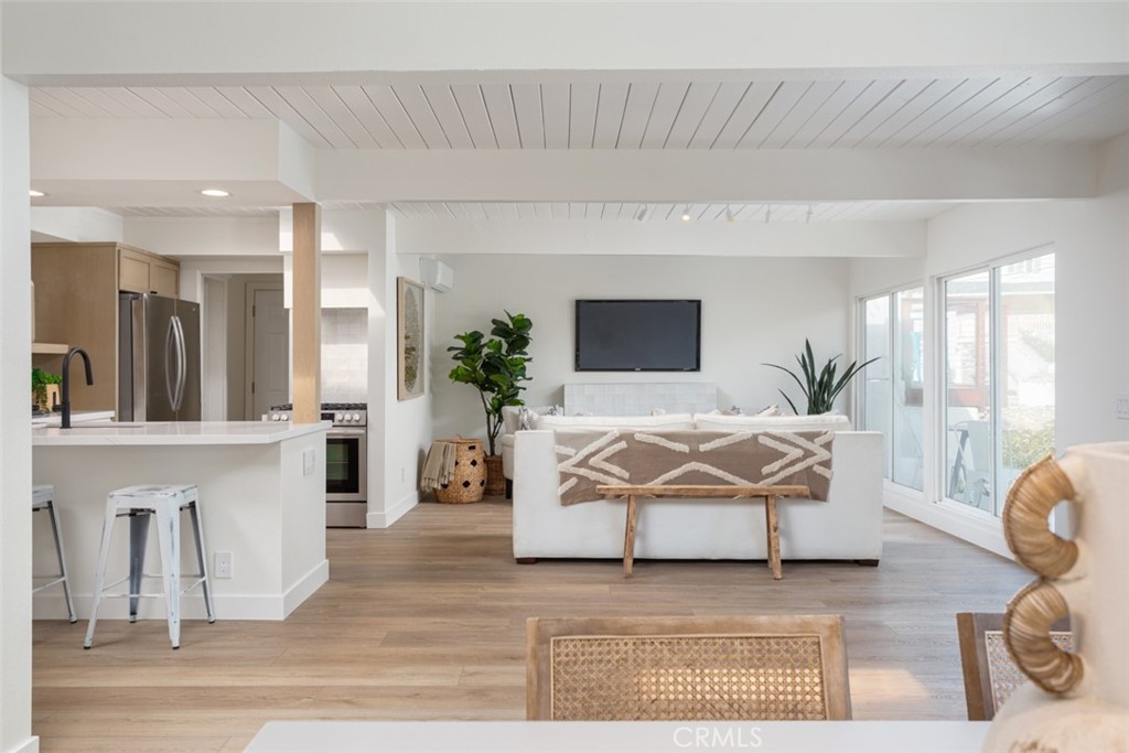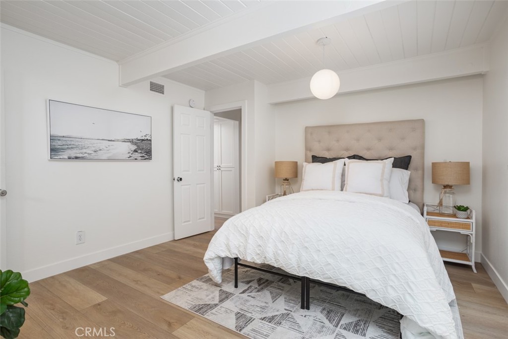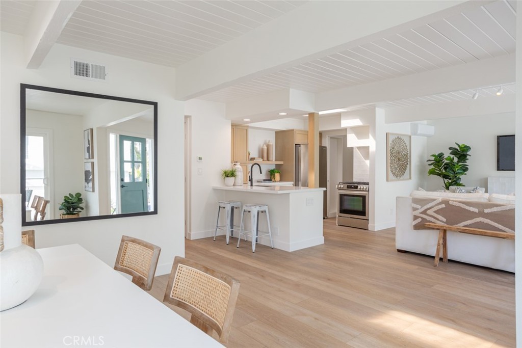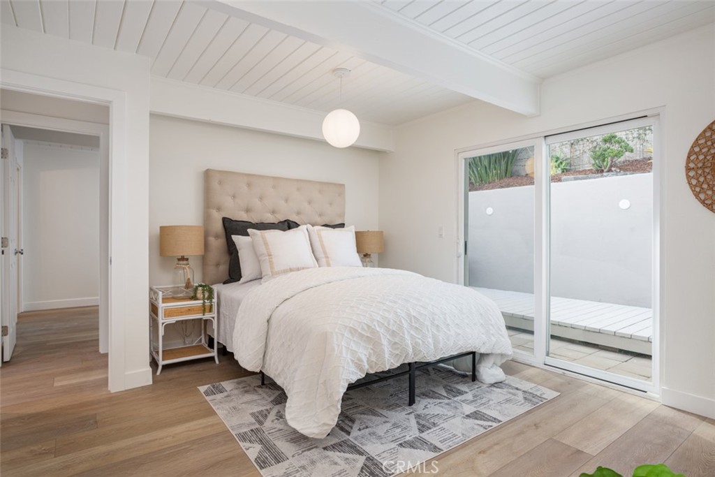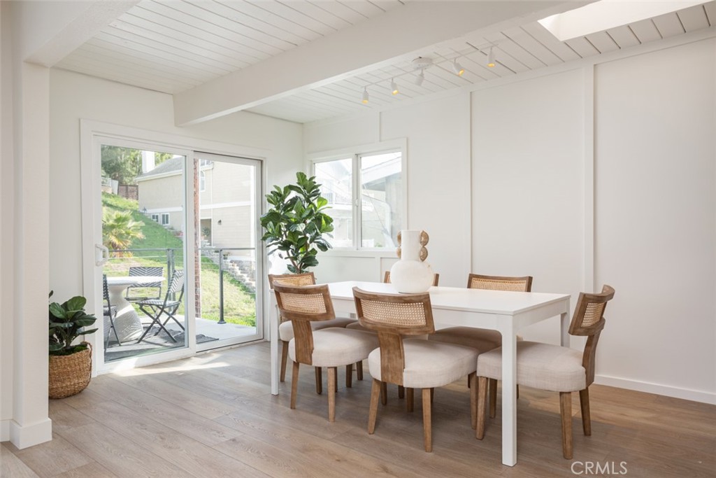Very rare opportunity located in the heart of Lantern Village with this newly renovated beach bungalow. Situated on a quiet cul-de-sac, this gorgeous single-level home offers form, function, and a dream location and a very close distance to Dana Point's beautiful beaches and Dana Point Harbor. An incredible open floor plan flooded with natural light from skylights and floor-to-ceiling windows. Beamed ceilings and white oak LVP flooring throughout give the home a warm and comforting vibe. The kitchen features stainless appliances, Quartz countertops and backsplash, custom oak and white shaker cabinetry, and a convenient laundry room with outdoor access. The living room has a cozy fireplace and flows seamlessly to a spacious dining area that opens to the front deck. The primary suite features a walk-in closet and stunning en-suite bathroom with hand-cut tile, statement vanity, and walk-in shower with rainhead. The primary bedroom has direct access to the very private backyard with ground deck, lush landscaping, and a cute space to string bistro lights and enjoy warm California evenings. The secondary bedroom also has its own en-suite bathroom. The spacious garage has a large dumbwaiter to the kitchen area, and enough space for an additional freezer or refrigerator. The home is walking distance to The Row, Doheny State Beach, Dana Point Harbor, and everything that embodies the quintessential beach lifestyle of Dana Point. This property is a truly rare find and a must see.