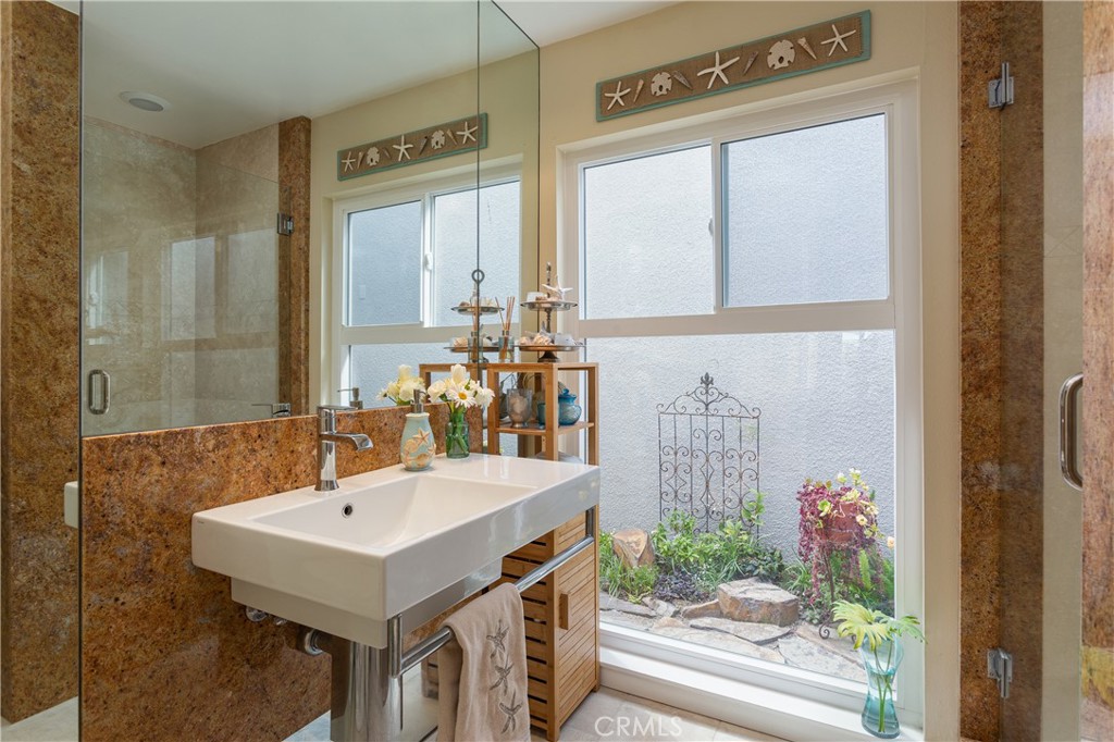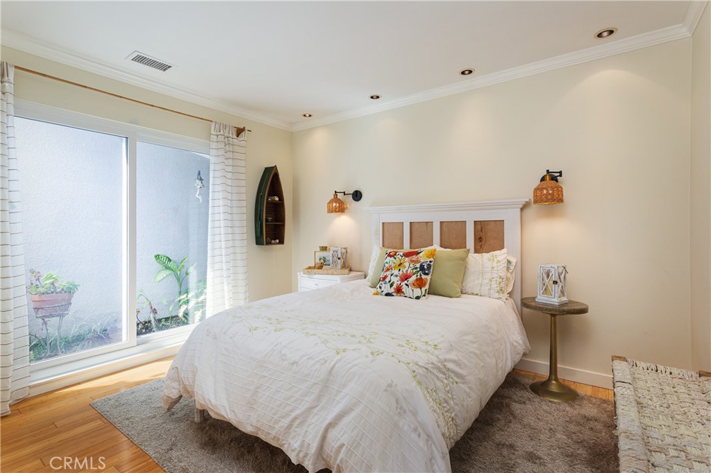 The kitchen is appointed with solid cherry wood cabinetry, Bosch refrigerator, gas range, granite countertops, and a side-by-side washer and dryer closet. The primary suite offers a walk-in closet, an en suite bath with a walk-in shower, and French pocket doors that make the room feel even more open and airy. A sweet interior atrium adds a sense of calm, accessed from the second bedroom.