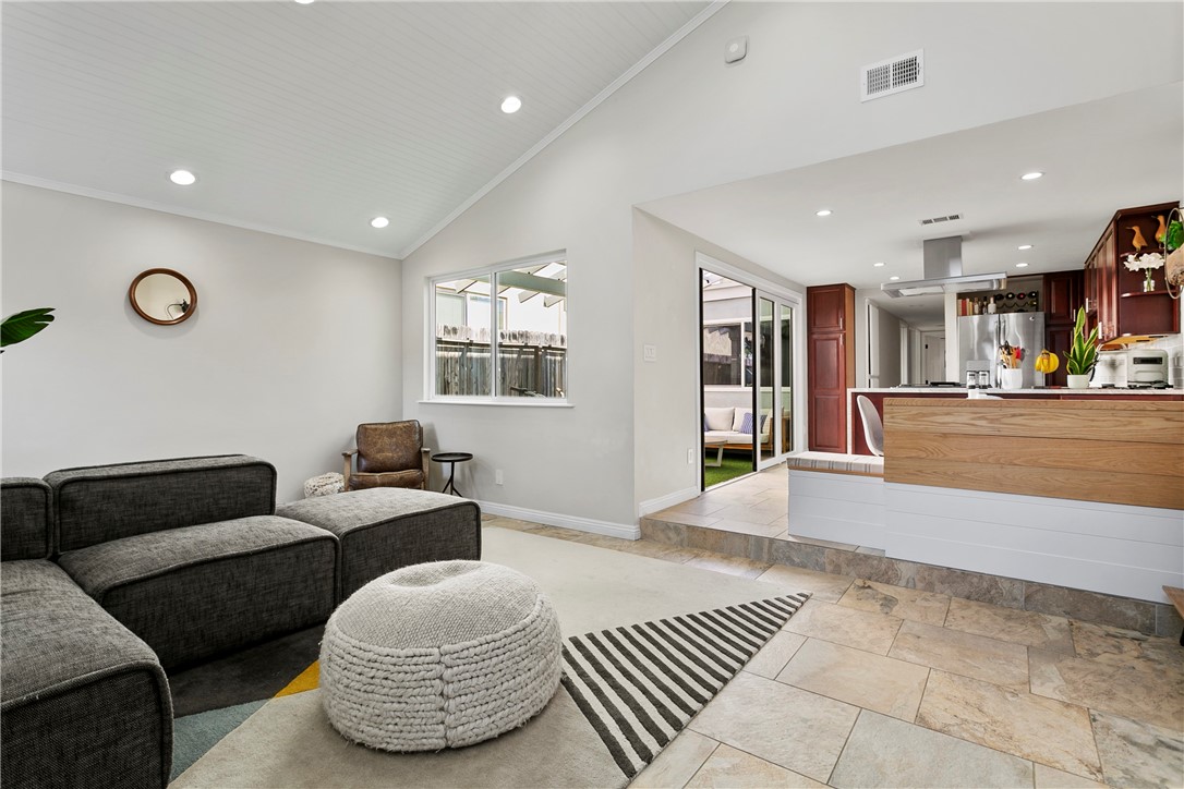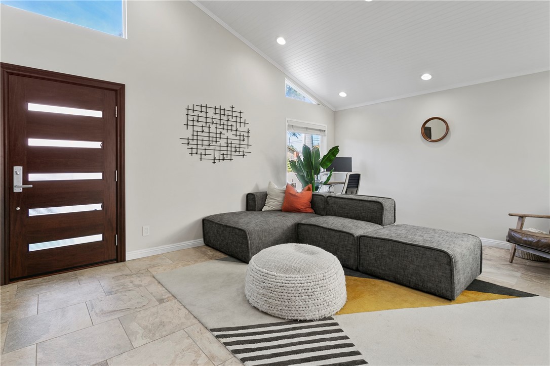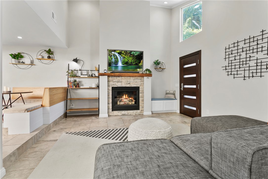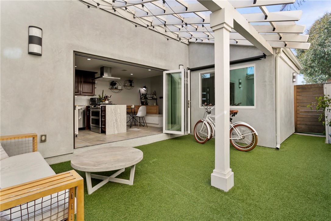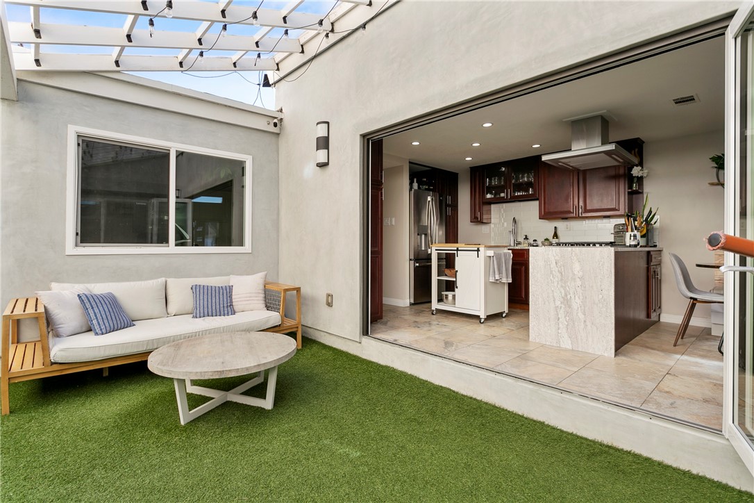 This beautifully upgraded Downtown Huntington Beach home offers the best of beach-close living. With exceptional curb appeal, it features high-end finishes like a custom stacked stone exterior, porcelain tile floors, Ipe wood gates, skylights, and custom folding doors. The enclosed front patio is perfect for enjoying the ocean breeze by the fireplace. Inside, natural light pours in through large windows and vaulted ceilings, highlighting the open floor plan that flows into a kitchen with soft-close cabinets, granite countertops, and stainless steel appliances. Panoramic folding doors open to a private interior patio, ideal for entertaining. The updated bathroom features subway tile, and both guest bedrooms are spacious, with one overlooking the patio. The primary bedroom includes an en-suite bath with dual sinks. Just a short walk to Pacific City, Main Street, and the beach, this home offers the ultimate coastal lifestyle.