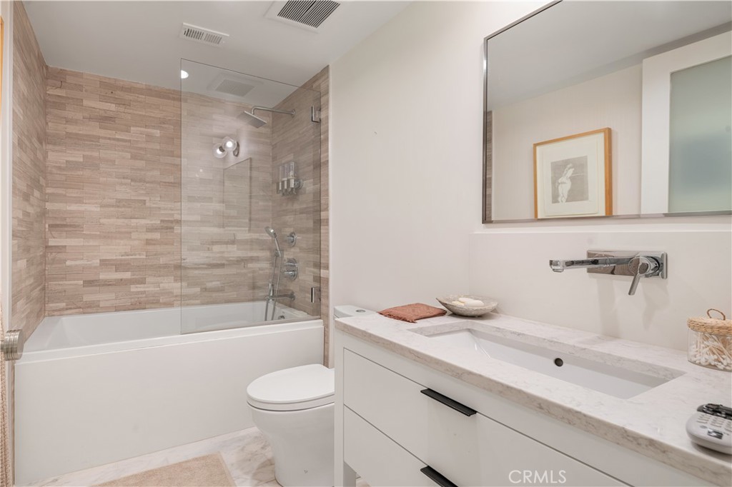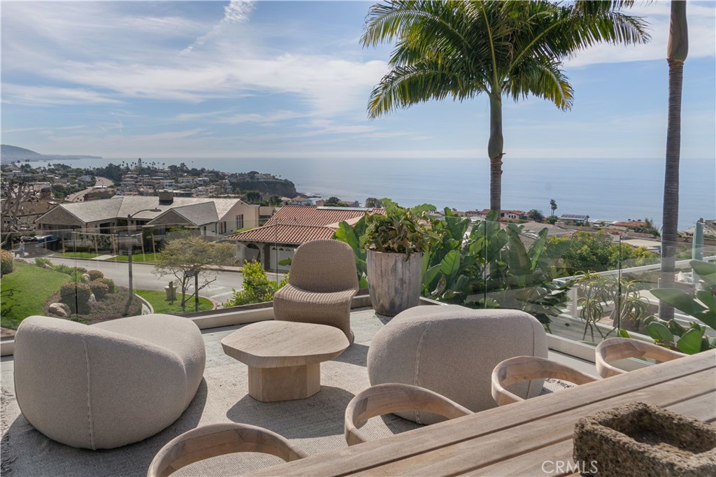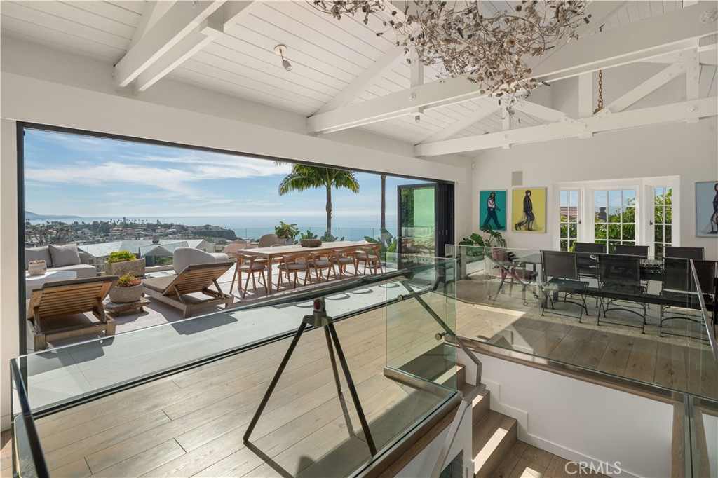 The main living level seamlessly blends indoor and outdoor living. Expansive living and dining areas open to the terrace through a wall-to-wall La Cantina glass door system, creating a stunning connection to the outdoors. Nearly 700 square feet of ocean-view terrace space provides the ideal setting for entertaining or unwinding while enjoying sweeping vistas of Emerald Bay's whitewater coastline, the Dana Point Headlands, Laguna Beach city lights, and unforgettable sunsets.