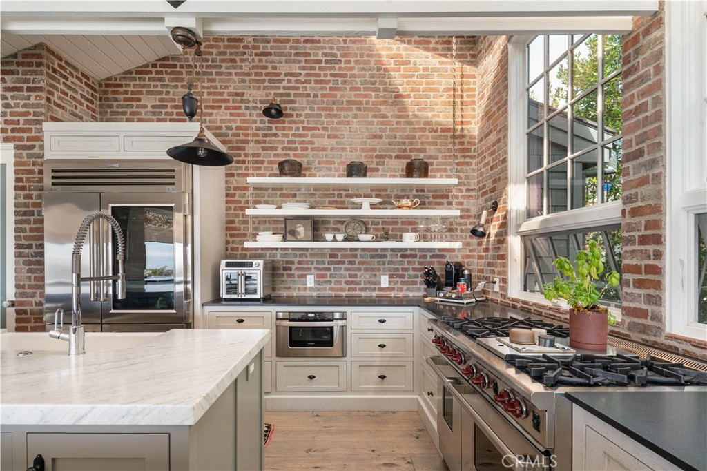 The modern chef's kitchen features a seated island, Sub-Zero and Wolf appliances, and a walk-in pantry, all positioned to capture the same spectacular ocean views.